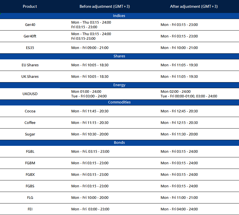 Starting from October 29, 2023, the trading hours of some MT4/MT5 products will change due to the upcoming Daylight Saving Time change in the EU/UK.