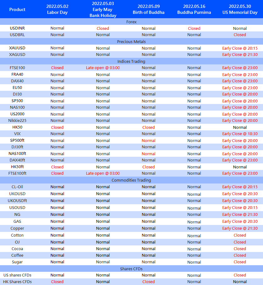 The above time is MT4/5 server time. The trading time of other products is not affected. The above data may be subject to change. Please refer to the actual time on MT4/5.