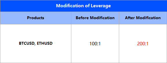 1. The leverage of BTCUSD and ETHUSD will be 200:1.