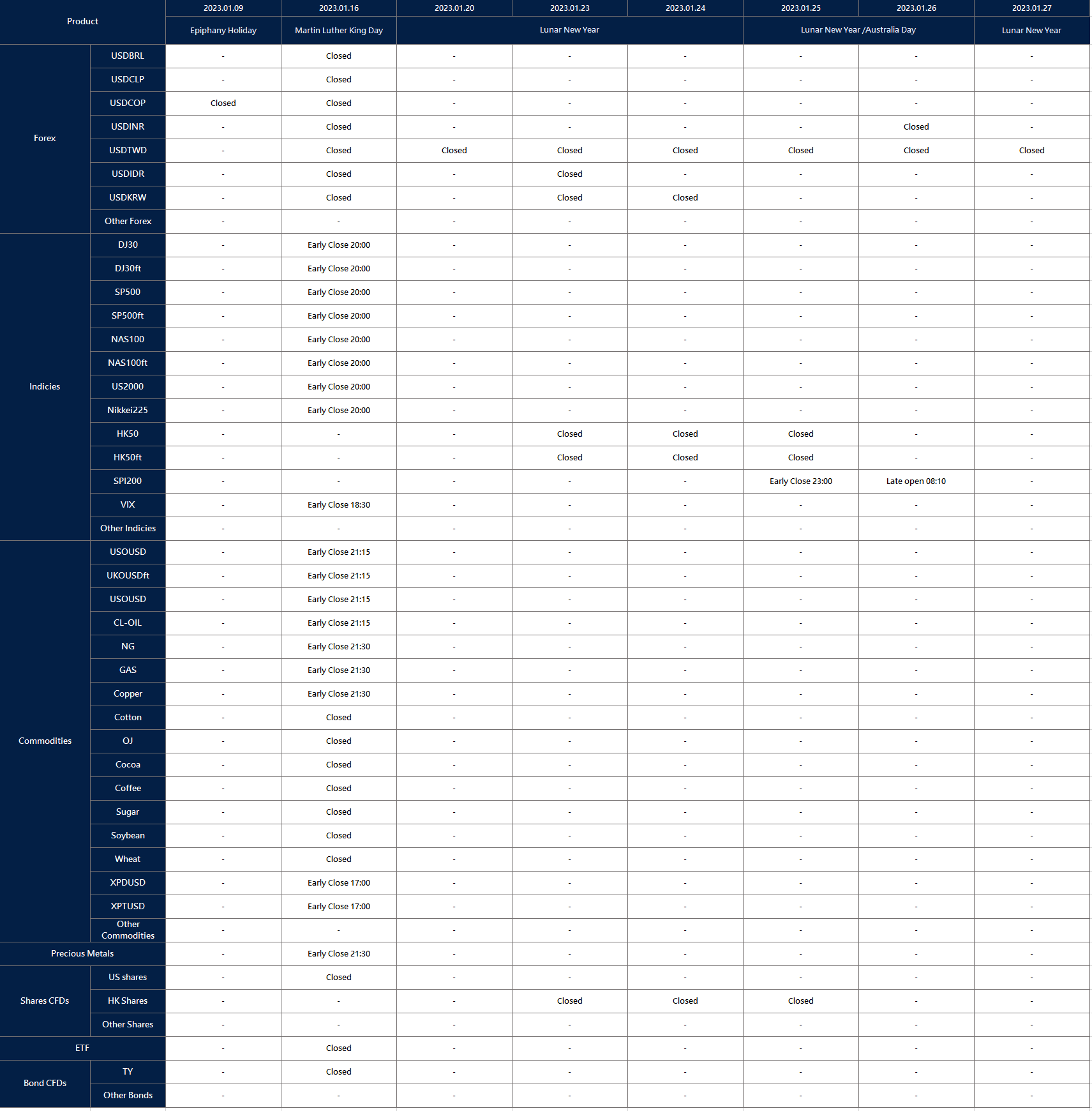 Please note that the following instruments’ trading hours will be affected by the upcoming holidays.