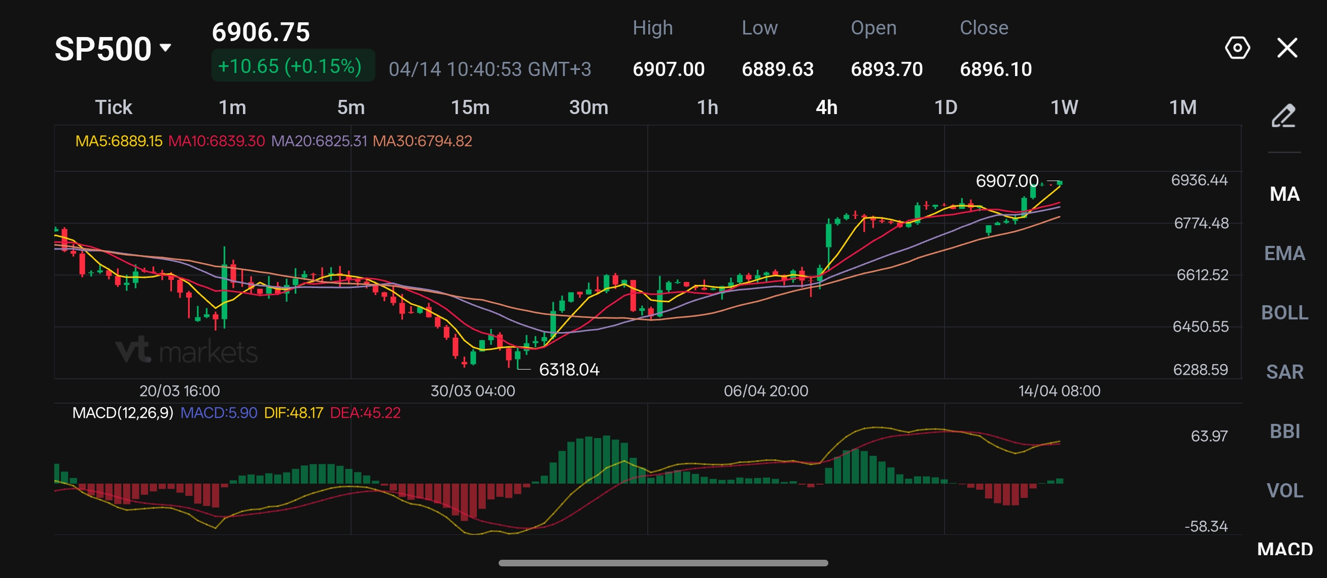 The index established a local bottom near 6318.04 on March 30. Since then, it has maintained a consistent upward trajectory, characterised by higher highs and higher lows. The current price of 6906.75 is hovering just below the recent peak of 6907.00, suggesting the market is testing immediate resistance.