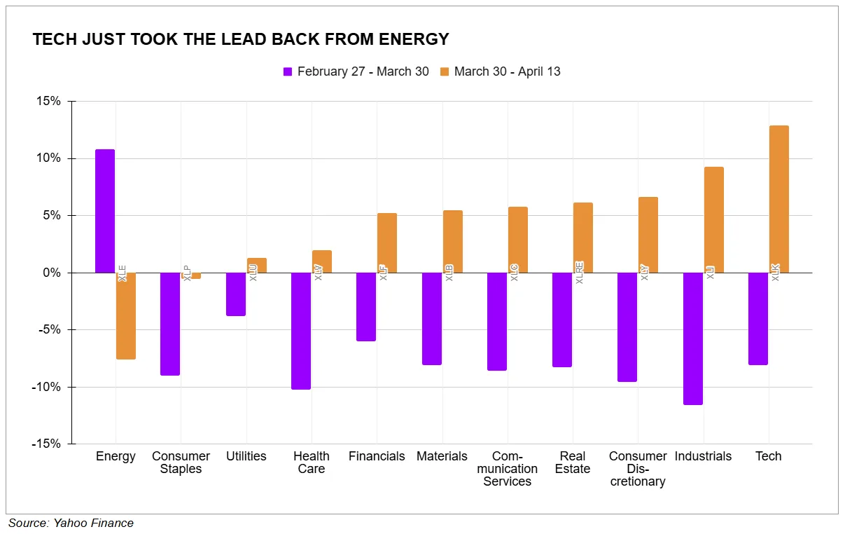 The graph below clearly shows the shift in sector performance, with tech stocks surging since March 30, while energy stocks have started to decline. This reversal highlights how tech, which had lagged behind, is now leading the market.