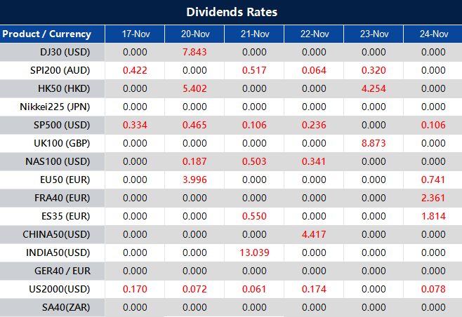 Please note that the dividends of the following products will be adjusted accordingly. Index dividends will be executed separately through a balance statement directly to your trading account, and the comment will be in the following format “Div & Product Name & Net Volume ”.