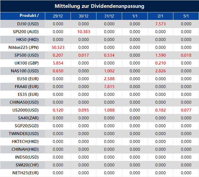 Bitte beachten Sie, dass die Dividenden der folgenden Produkte entsprechend angepasst werden. Index-Dividenden werden separat über eine Kontoabrechnung direkt auf Ihr Handelskonto gebucht. Der Kommentar dazu erfolgt im folgenden Format: „Div & Produktname & Nettovolumen“.