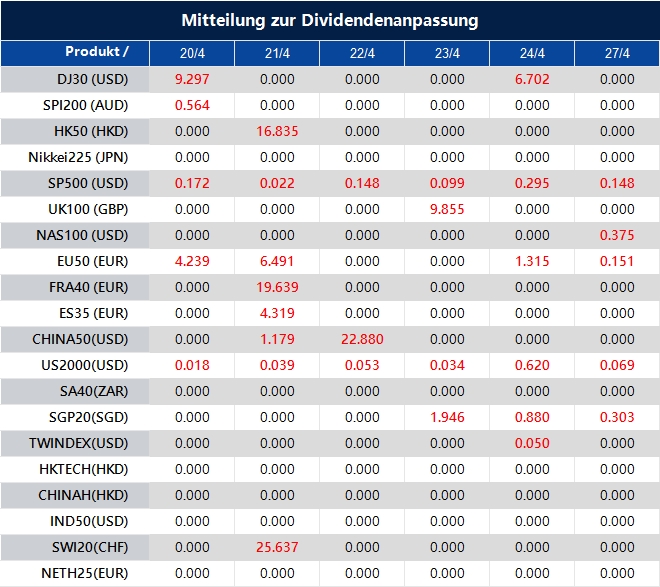 Bitte beachten Sie, dass die Dividenden der folgenden Produkte entsprechend angepasst werden. Index-Dividenden werden separat über eine Kontoabrechnung direkt auf Ihr Handelskonto gebucht. Der Kommentar dazu erfolgt im folgenden Format: „Div & Produktname & Nettovolumen“.