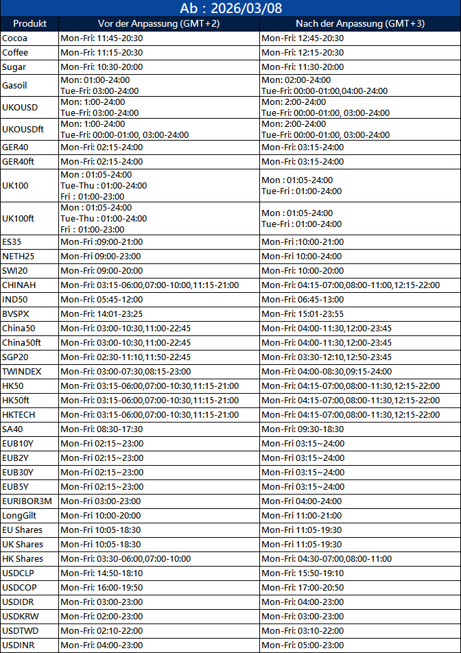Die Handelszeiten einiger Produkte auf MT4/MT5 werden aufgrund der Umstellung von der Winterzeit auf die Sommerzeit (Daylight Saving Time) in den USA angepasst.