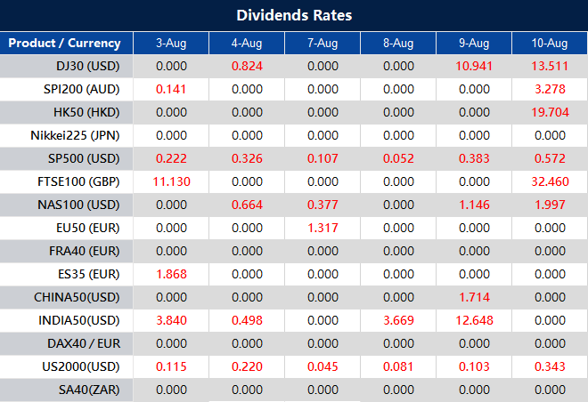 Please note that the dividends of the following products will be adjusted accordingly. Index dividends will be executed separately through a balance statement directly to your trading account, and the comment will be in the following format “Div & Product Name & Net Volume ”.