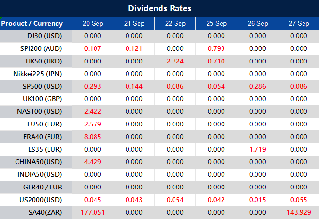 Please note that the dividends of the following products will be adjusted accordingly. Index dividends will be executed separately through a balance statement directly to your trading account, and the comment will be in the following format “Div & Product Name & Net Volume ”.