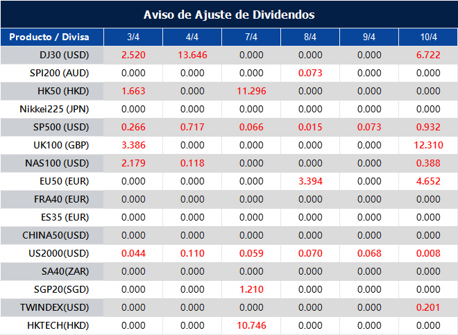 Tenga en cuenta que los dividendos de los siguientes productos se ajustarán en consecuencia. Los dividendos de los índices se ejecutarán por separado a través de un extracto de saldo directamente en su cuenta de trading, y el comentario tendrá el siguiente formato: “Div & Nombre del Producto & Volumen Neto”.