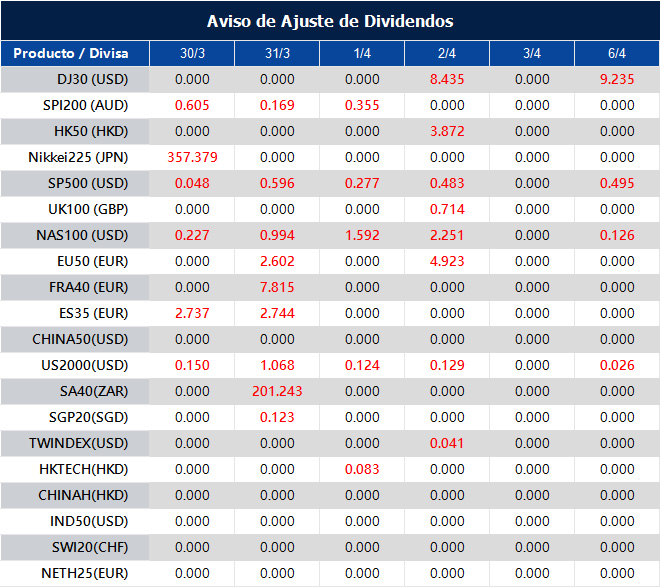 Tenga en cuenta que los dividendos de los siguientes productos se ajustarán en consecuencia. Los dividendos de los índices se ejecutarán por separado a través de un extracto de saldo directamente en su cuenta de trading, y el comentario tendrá el siguiente formato: “Div & Nombre del Producto & Volumen Neto”.