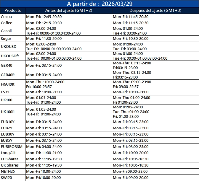 El horario de operación de algunos productos en MT4/MT5 se modificará debido al cambio de horario de verano (Daylight Saving Time) en Europa/Reino Unido.