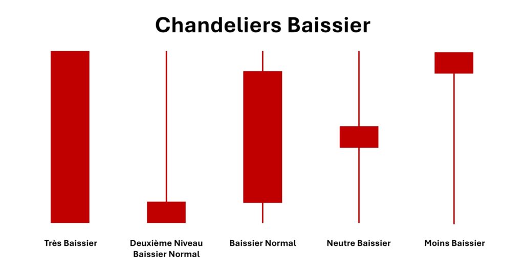 La couleur : Montre si le marché a progressé à la hausse (haussier) ou à la baisse (baissier). En général, un chandelier vert ou blanc est haussier, tandis qu’un chandelier rouge ou noir est baissier.