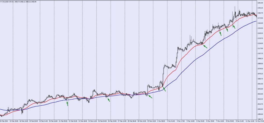 Other traders use 2 Moving Averages (slower- and faster-moving averages) and the candles (price) to know where the market is going and if there is a potential reversal