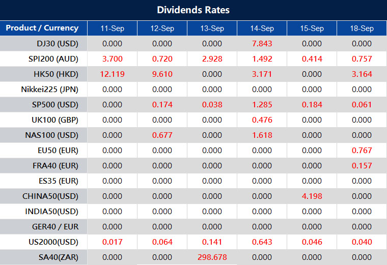 Please note that the dividends of the following products will be adjusted accordingly. Index dividends will be executed separately through a balance statement directly to your trading account, and the comment will be in the following format “Div & Product Name & Net Volume ”.