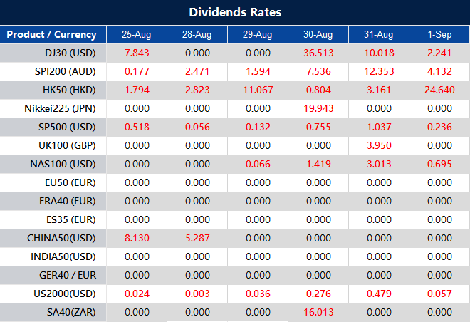 Please note that the dividends of the following products will be adjusted accordingly. Index dividends will be executed separately through a balance statement directly to your trading account, and the comment will be in the following format “Div & Product Name & Net Volume ”.