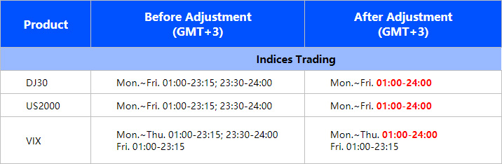 There are no longer be a break in trading time from 23:15-23:30 (GMT+3) for the following indices.