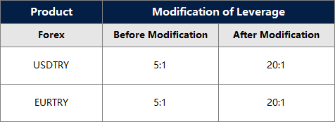 1. The TRY Crosses product’s leverage will be modified from 5 : 1 to 20 : 1