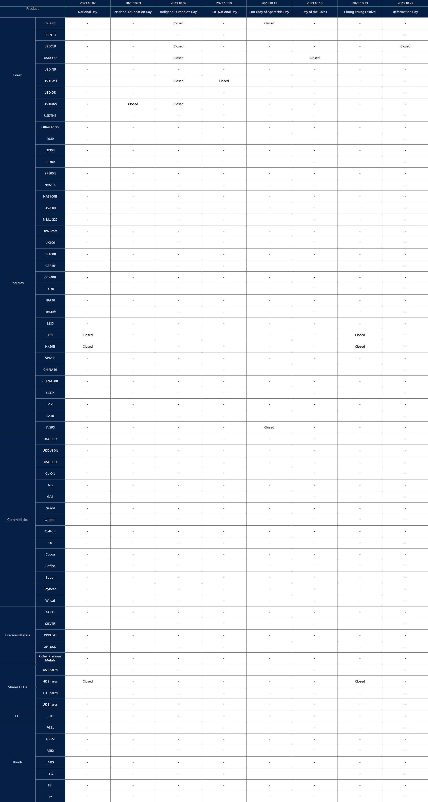 Please note that the following instruments’ trading hours will be affected by the upcoming holidays.