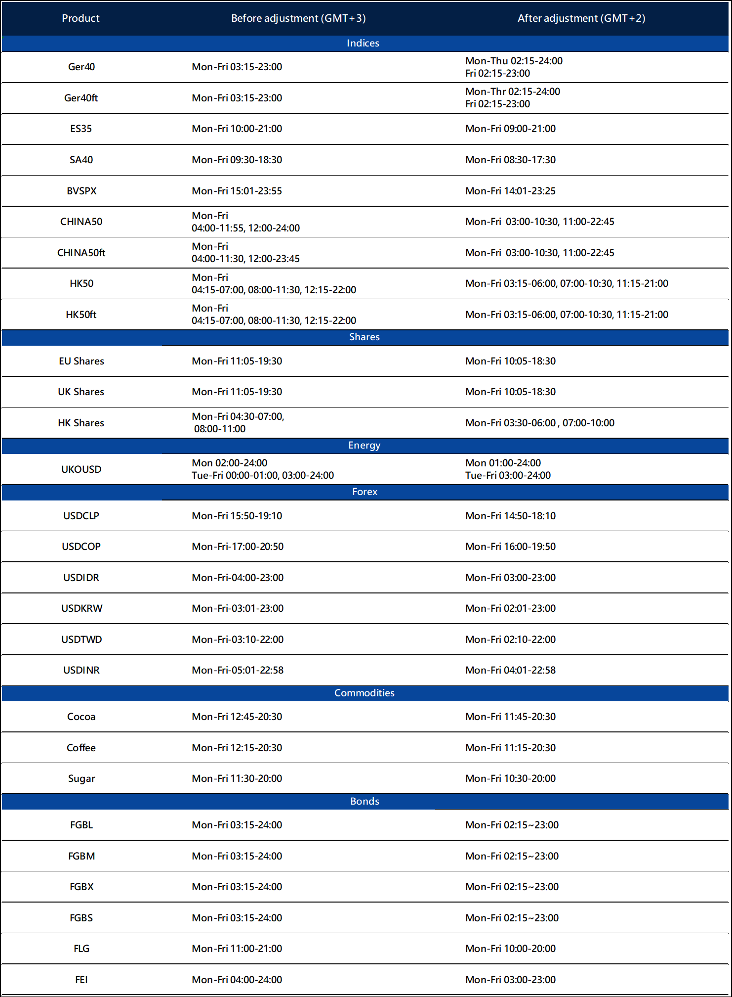 Due to the end of U.S. Daylight Saving Time on November 6, 2023, the trading hours for certain products on MT4/MT5 will change. On the same day, the server time will also change from GMT+3 to GMT+2.