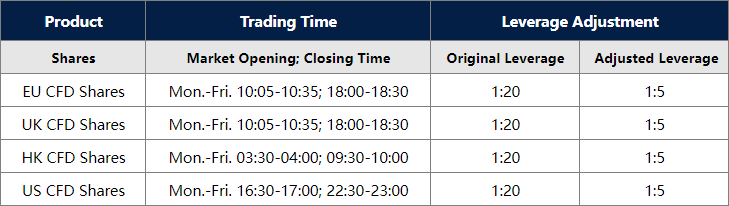 1. Adjustment: New positions opened within 30 minutes before market closing and after market opening will start with leverage of 1:5. After the mentioned period, the leverage will be resumed to original leverage and will not be adjusted back to 1:5.