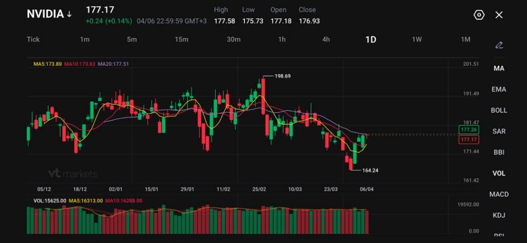 NVIDIA trades at 177.17, up 0.24 (+0.14%), while the wider market heads into earnings season with leadership still concentrated in technology and financials.