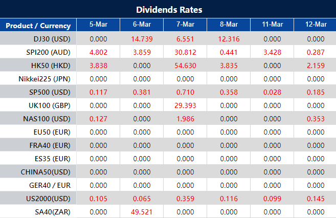 Please note that the dividends of the following products will be adjusted accordingly. Index dividends will be executed separately through a balance statement directly to your trading account, and the comment will be in the following format “Div & Product Name & Net Volume ”.