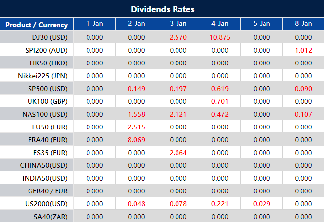 Please note that the dividends of the following products will be adjusted accordingly. Index dividends will be executed separately through a balance statement directly to your trading account, and the comment will be in the following format “Div & Product Name & Net Volume ”.