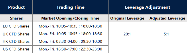 1. All specifications for Shares CFD stay the same except leverage during the mentioned period.