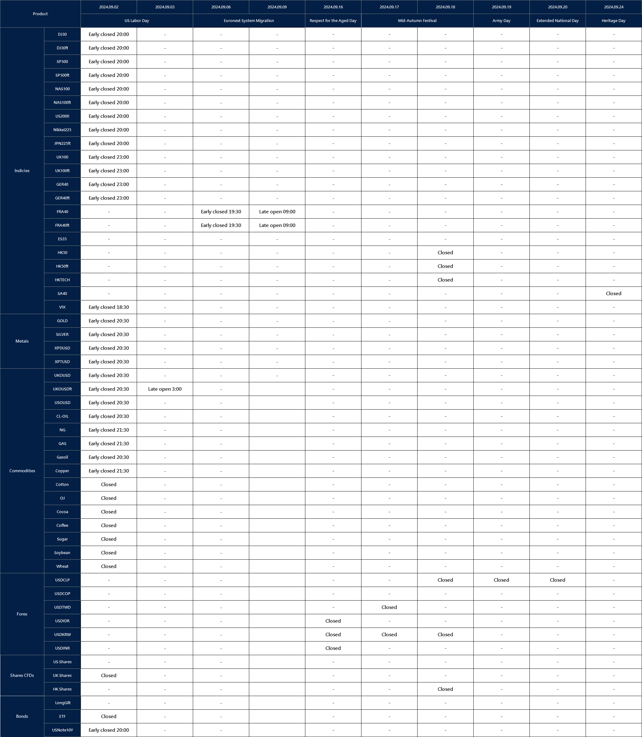 Note: The dash sign (-) indicates normal trading hours.